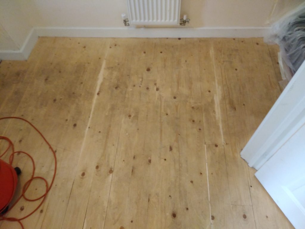 You basically sand the big area with a floor sander like above or even a hand sander on a softwood floor. In this case, we used 36 grit then 60 then filled gaps. Did this with wood glue and sawdust from the floor after the original sealer dust and dirt was lifted. More 60 then followed with 100 grit finish. You then have to hand sand the edges with an edge sander or orbital sander. Always sand with the grain. Once the dust has settled and you have hoovered every bit up you can seal it up.